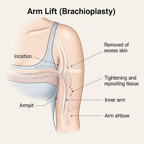 Подтяжка рук — это хирургическая операция, которая включает удаление провисшей кожи и избыточного жира с внутренней и задней части верхней руки, обычно возникающих после значительной потери веса или старения. Цель операции — сделать руки более упругими, гладкими и эстетически привлекательными.